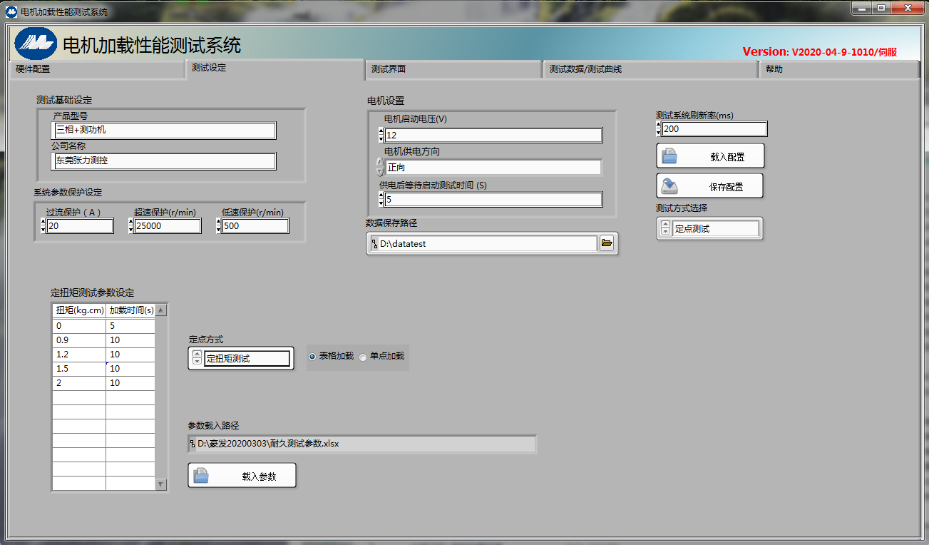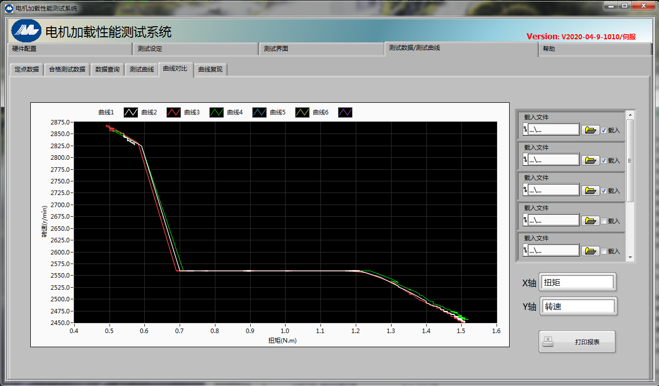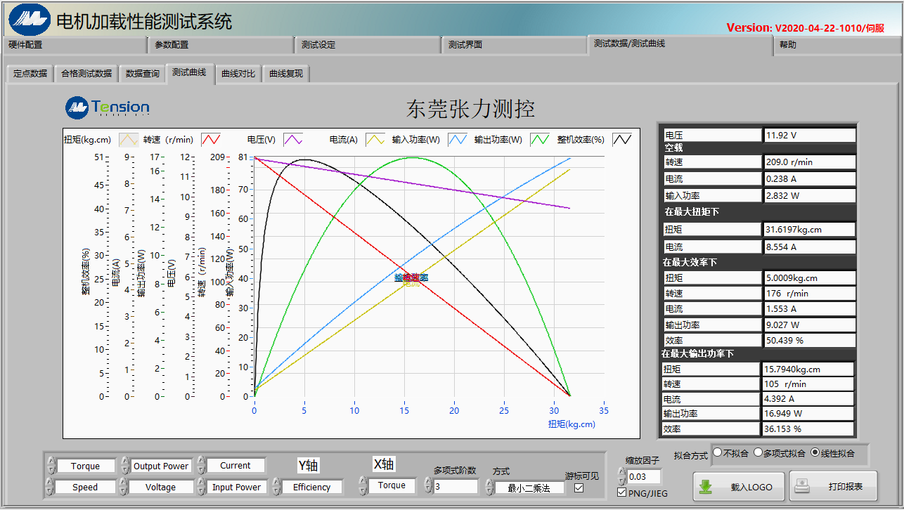 •自動測試方式:即負(fù)載根據(jù)設(shè)置自動加載,掃描出電機(jī)從空載到堵轉(zhuǎn)(或設(shè)定值)的特征曲線。因為電機(jī)在零載到相應(yīng)負(fù)載和相應(yīng)負(fù)載到空載這個過程中,下降曲線和回升曲線是存在相應(yīng)誤差,系統(tǒng)可以通過下降曲線和回升曲線計算擬合出電機(jī)最真實的曲線,所以此界面就是最好的測試方式。