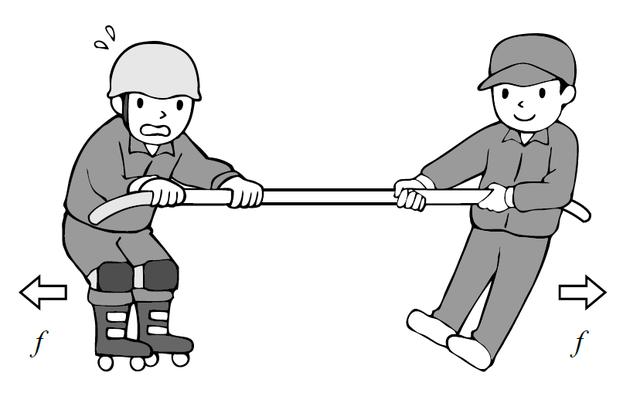 如果兩人都拉,則繩子上會有張力。在靜止狀態下, 拉力(F)和被拉力(F)保持均衡, 產生的張力相同, 這很容易理解。