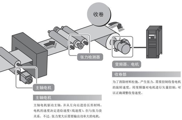 為了消除材料松弛、產生張力,需要控制收卷電機的旋轉速度。用變頻器對電機進行矢量控制,可以正確調整收卷速度。