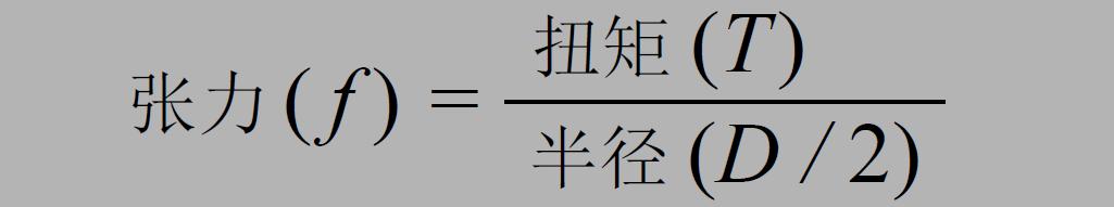 下面說明放卷長形材料時的張力和扭矩的關系。扭矩是作用于旋轉軸的力。放卷長形材料時,卷軸的制動扭矩(制動器扭矩)比電機扭矩更弱,所以材料被向右側放卷。此時,材料所受到的張力(f) 由較弱一側的制動扭矩(T)決定, 扭矩(T) 和張力(f)的關系如下公式所示: