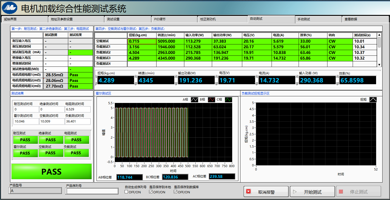 3.負載測試:測試電機在不同負載下的扭矩,轉速,電壓,電流,功率,并且判斷是否合格